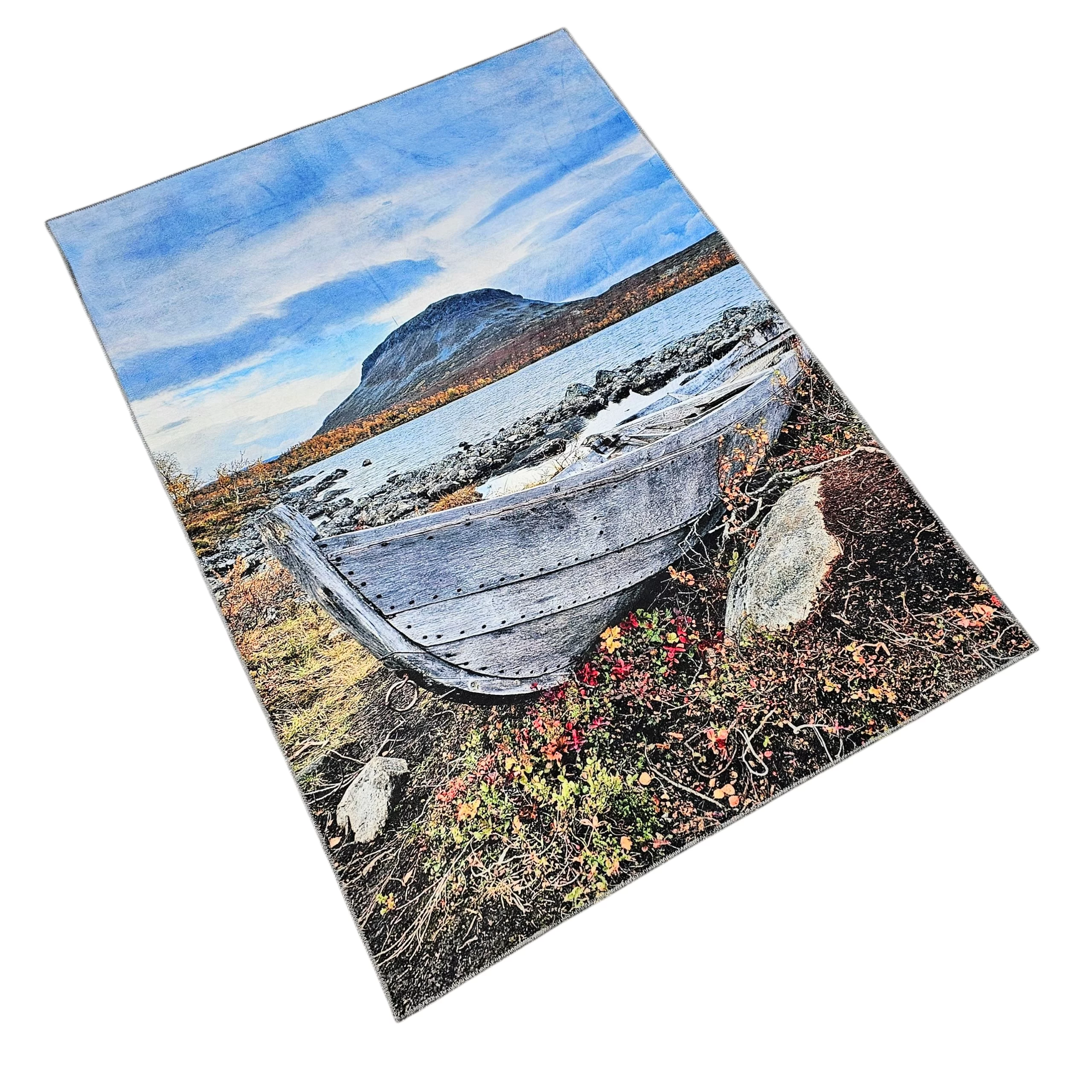 Erämaa matto tuo kotiisi palan Lapin ainutlaatuista luontoa ja historiaa. Maton pinnalle on laadukkaalla printtitekniikalla ikuistettu maisema, jossa Saana-tunturi kohoaa taustalla ja etualalla lepää tunnettu vanha vene, joka on vuosien varrella tullut monelle Kilpisjärven kävijälle tutuksi.